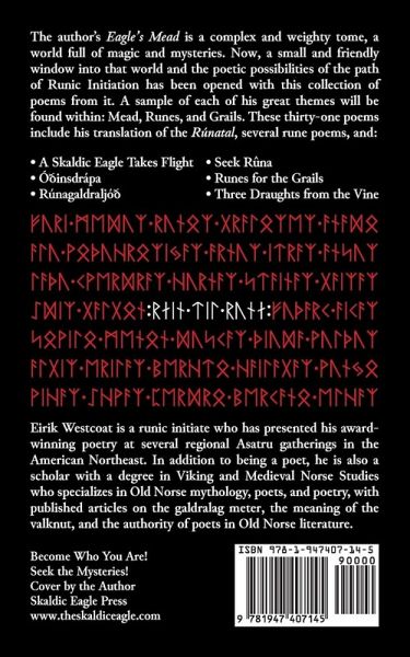 The author's Eagle's Mead is a complex and weighty tome, a world full of magic and mysteries. Now, a small and friendly window into that world and the poetic possibilities of the path of Runic Initiation has been opened with this collection of poems from it. A sample of each of his great themes will be found within: Mead, Runes, and Grails. These thirty-one poems include his translation of the Rúnatal, several rune poems, and: A Skaldic Eagle Takes Flight Óðinsdrápa Rúnagaldraljóð Seek Rûna Runes for the Grails Three Draughts from the Vine Eirik Westcoat is a runic initiate who has presented his award-winning poetry at several regional Asatru gatherings in the American Northeast. In addition to being a poet, he is also a scholar with a degree in Viking and Medieval Norse Studies who specializes in Old Norse mythology, poets, and poetry, with published articles on the galdralag meter, the meaning of the valknut, and the authority of poets in Old Norse literature. Become Who You Are! Seek the Mysteries!