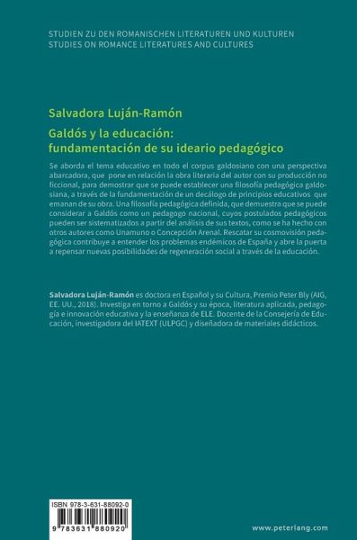 Se aborda el tema educativo en todo el corpus galdosiano con una perspectiva abarcadora, que pone en relación la obra literaria del autor con su producción no ficcional, para demostrar que se puede establecer una filosofía pedagógica galdosiana, a través de la fundamentación de un decálogo de principios educativos que emanan de su obra. Una filosofía pedagógica definida, que demuestra que se puede considerar a Galdós como un pedagogo nacional, cuyos postulados pedagógicos pueden ser sistematizados a partir del análisis de sus textos, como se ha hecho con otros autores como Unamuno o Concepción Arenal. Rescatar su cosmovisión pedagógica contribuye a entender los problemas endémicos de España y abre la puerta a repensar nuevas posibilidades de regeneración social a través de la educación.