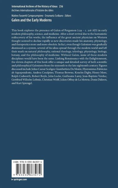 This book explores the presence of Galen of Pergamon (129 - c. 216 AD) in early modern philosophy, science, and medicine. After a short revival due to the humanistic rediscovery of his works, the influence of the great ancient physician on Western thought seemed to decline rapidly as new discoveries made his anatomy, physiology, and therapeutics more and more obsolete. In fact, even though Galenism was gradually dismissed as a system, several of his ideas spread through the modern world and left their mark on natural philosophy, rational theology, teleology, physiology, biology, botany, and the philosophy of medicine. Without Galen, none of these modern disciplines would have been the same. Linking Renaissance with the Enlightenment, the eleven chapters of this book offer a unique and detailed survey of both scientific and philosophical Galenisms from the sixteenth to the late eighteenth century. Figures discussed include Julius Caesar Scaliger, Giambattista Da Monte, Hyeronimus Fabricius ab Aquapendente, Andrea Cesalpino, Thomas Browne, Kenelm Digby, Henry More, Ralph Cudworth, Robert Boyle, John Locke, Guillaume Lamy, Jean-Baptiste Verduc, Gottfried Wilhelm Leibniz, Christian Wolff, Julien Offray de La Mettrie, Denis Diderot, and Kurt Sprengel.
