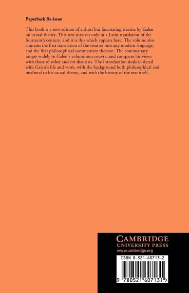 This book is a new edition of a short but fascinating treatise by Galen on causal theory. This text survives only in a Latin translation of the fourteenth century, and it is this which appears here. The volume also contains the first translation of the treatise into any modern language, and the first philosophical commentary thereon. The commentary ranges widely in Galen's voluminous (?)uvre, and compares his views with those of other ancient theorists. The introduction deals in detail with Galen's life and work, with the background both philosophical and medieval to his causal theory, and with the history of the text itself.