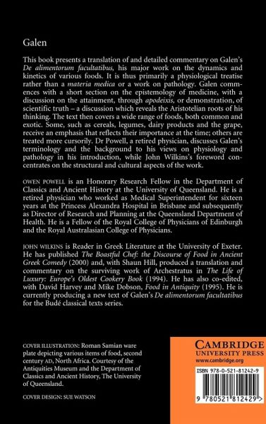 This book presents a translation of and detailed commentary on Galen's De alimentorum facultatibus - his major work on the dynamics and kinetics of various foods. It is thus primarily a physiological treatise rather than a materia medica or a work on pathology. Galen commences with a short section on the epistemology of medicine, with a discussion on the attainment, through apodeixis or demonstration, of scientific truth - a discussion which reveals the Aristotelian roots of his thinking. The text then covers a wide range of foods, both common and exotic. Some, such as cereals, legumes, dairy products and the grape, receive an emphasis that reflects their importance at the time; others are treated more cursorily. Dr Powell, an expert in gastroenterology, discusses Galen's terminology and the background to his views on physiology and pathology in his introduction, while John Wilkins' foreword concentrates on the structural and cultural aspects of the work.
