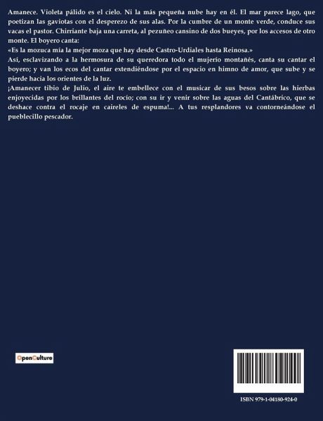 Amanece. Violeta pálido es el cielo. Ni la más pequeña nube hay en él. El mar parece lago, que poetizan las gaviotas con el desperezo de sus alas. Por la cumbre de un monte verde, conduce sus vacas el pastor. Chirriante baja una carreta, al pezuñeo cansino de dos bueyes, por los accesos de otro monte. El boyero canta: «Es la mozuca mía la mejor moza que hay desde Castro-Urdiales hasta Reinosa.» Así, esclavizando a la hermosura de su queredora todo el mujerío montañés, canta su cantar el boyero; y van los ecos del cantar extendiéndose por el espacio en himno de amor, que sube y se pierde hacia los orientes de la luz. ¡Amanecer tibio de Julio, el aire te embellece con el musicar de sus besos sobre las hierbas enjoyecidas por los brillantes del rocío; con su ir y venir sobre las aguas del Cantábrico, que se deshace contra el rocaje en caireles de espuma!... A tus resplandores va contorneándose el pueblecillo pescador.