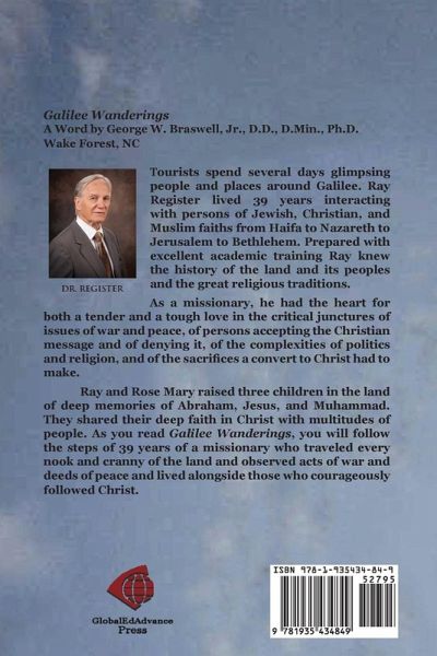 Tourists spend several days glimpsing people and places around Galilee. Dr. Ray Register lived 39 years interacting with persons of Jewish, Christian, and Muslim faiths from Haifa to Nazareth to Jerusalem to Bethlehem. Prepared with excellent academic training the author knew the history of the land and its peoples and the great religious traditions. The reader gets a sense of the personalities, the cultures, the history, and politics of the whole area. As a missionary, he had the heart for both tender and tough love in the critical issues of war and peace, of persons accepting the Christian message and of denying it, of the complexities of politics and religion, and of the sacrifices a convert to Christ had to make. Ray and Rose Mary raised three children in the land of deep memories of Abraham, Jesus, and Muhammad. As you read Galilee Wanderings, you will follow the steps of a missionary who traveled every nook and cranny of the land and observed acts of war and deeds of peace and lived alongside those who courageously followed Christ. Galilee Wanderings is a personal story of contrasts; North and South, East, and West, good and evil, war and peace, success and failure, beauty and ugliness, conservatism and liberalism, blessings and curses, monotheism and Trinity. It is experiences of mystery and revelation, of how God took a boy conceived out of wedlock and made him a man in the Holy Land. Raised by a Yankee mother of rich ancestry and a macho southern father who was a Scout Master and problem drinker all at the same time, Ray's story is of God's discipline and grace during his Galilee Wanderings.