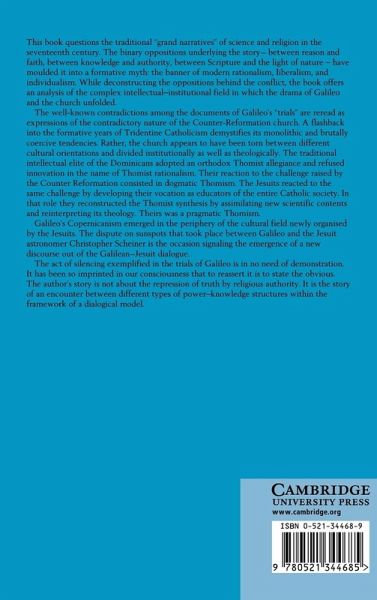 This book questions the traditional "grand narratives" of science and religion in the seventeenth century. The binary oppositions underlying the story - between reason and faith, between knowledge and authority, between Scripture and the light of nature - have moulded it into a formative myth: the banner of modern rationalism, liberalism, and individualism. While deconstructing the oppositions behind the conflict, the book offers an analysis of the complex intellectual/institutional field in which the drama of Galileo and the Church unfolded. The well-known contradictions among the documents of Galileo's trials are reread as expressions of the contradictory nature of the Counter-Reformation church. A flashback into the formative years of Tridentine Catholicism demystifies its monolithic and brutally coercive tendencies. Rather, the church appears to have been torn between different cultural orientations and divided institutionally as well as theologically. The traditional intellectual elite of the Dominicans adopted an orthodox Thomist allegiance and refused innovation in the name of Thomist rationalism. Their reaction to the challenge raised by the Counter-Reformation consisted in dogmatic Thomism. The Jesuits reacted to the same challenge by developing their vocation as educators of the entire Catholic society. In that role they reconstructed the Thomist synthesis by assimilating new scientific contents and reinterpreting its theology. Theirs was a pragmatic Thomism. Galileo's Copernicanism emerged in the periphery of the cultural field newly organised by the Jesuits. The dispute on sunspots that took place between Galileo and the Jesuit astronomer Christopher Scheiner is the occasionsignaling the emergence of a new discourse out of the Galileo-Jesuit dialogue. The act of silencing exemplified in the trials of Galileo is in no need of demonstration. It has been so imprinted in our consciousness that to reassert it is to state the obvious. The author's story is not about the repression of truth by religious authority. It is the story of an encounter between different types of power-knowledge structures within the framework of a dialogical model.