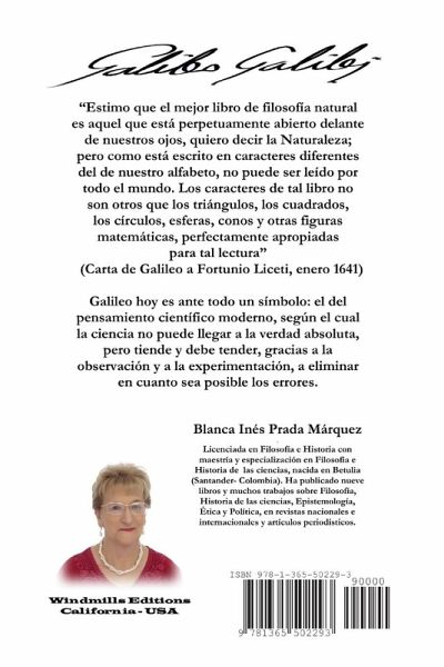 "Estimo que el mejor libro de filosofía natural es aquel que está perpetuamente abierto delante de nuestros ojos, quiero decir la Naturaleza; pero como está escrito en caracteres diferentes del de nuestro alfabeto, no puede ser leído por todo el mundo. Los caracteres de tal libro no son otros que los triángulos, los cuadrados, los círculos, esferas, conos y otras figuras matemáticas, perfectamente apropiadas para tal lectura" (Carta de Galileo a Fortunio Liceti, enero 1641) Galileo hoy es ante todo un símbolo del pensamiento científico moderno, según el cual la ciencia no puede llegar a la verdad absoluta, pero tiende y debe tender, gracias a la observación y a la experimentación, a eliminar en cuanto sea posible los errores.
