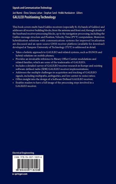 This book covers multi-band Galileo receivers (especially E1-E5 bands of Galileo) and addresses all receiver building blocks, from the antenna and front end, through details of the baseband receiver processing blocks, up to the navigation processing, including the Galileo message structure and Position, Velocity, Time (PVT) computation. Moreover, hybridization solutions with communications systems for improved localization are discussed and an open-source GNSS receiver platform (available for download) developed at Tampere University of Technology (TUT) is addressed in detail.