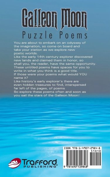 You are about to embark on an odyssey of the imagination, so come on board and take your station as we explore new poetic worlds. Like the early 14th century explorer discovered new lands and claimed them in honor, so shall you, the reader, have the same opportunity. These untitled poems have spaces for you to write in what you think is a good title. If those were your poems what would YOU name it? Like history's early explorer's there are even hidden treasures to find, interspersed far left of the pages, of poems So explore these poems often and soon as you sail the stars of the Galleon Moon!