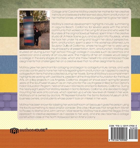 Collage artist Caroline McElroy credits her mother for her creative instincts and believes she first learned about form and function at her mother's knee, where she encouraged her to grow her talent. McElroy's creative development highlights include: summering in Laguna Beach, California, for several years with the artistic community that worked on the Living Art show and who were the founders of the original Sawdust Festival; spent time in the creative studio of LA Freak Scene guru and sculptor Vito Paulekas, where he took her under his wing and taught her about perspective, form, and function; spent a year in the workshop of famed Junk Sculptor Duffy of California, where he taught her to weld using his philosophy of presentation, form, and function. McElroy also studied art during junior high school through college in courses such as ceramics and watercolor and a variety of art course work. The majority of her art classes would assign a college in the early stages of a class, which she threw herself into and embraced those assignments that challenged her on a creative level that no other assignments could. McElroy grew her penchant for collaging and began to collage furniture, lamps, and walls and also continued to hone her instincts regarding form and function as it applied to creating collages from items that she collected during her travels. Some of McElroy's accomplishment highlights are working with Joel Wachs, president of the Andy Warhol Foundation for the Visual Arts, on a few projects in Los Angeles, California; staged art shows each spring for several years at The Southwest Museum as an instructor for the Los Angeles Unified School District's Indian Education Program; held art shows in Montecito and Santa Barbara, California. During the nearly eight years that McElroy resided in Santa Barbara, California, she decided to begin mounting her work onto canvas, which opened up a whole new level of interest in her work. McElroy's art is owned by doctors, PR Representative for the Santa Barbara Museum of Art, business owners, and students whose parent took an interest in her work. McElroy has been known for labeling her work bathroom art because it gives the person using the facility something to read and/or consider. She cites influences that range from Monet to Picasso to Warhol and John Lennon. Most recently, McElroy has studied the Reggio Emilia approach to creative expression as it applies to her work, and she also teaches a collage construction class at the North Hollywood Senior Artist's Colony.