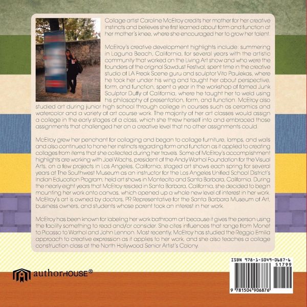 Collage artist Caroline McElroy credits her mother for her creative instincts and believes she first learned about form and function at her mother's knee, where she encouraged her to grow her talent. McElroy's creative development highlights include: summering in Laguna Beach, California, for several years with the artistic community that worked on the Living Art show and who were the founders of the original Sawdust Festival; spent time in the creative studio of LA Freak Scene guru and sculptor Vito Paulekas, where he took her under his wing and taught her about perspective, form, and function; spent a year in the workshop of famed Junk Sculptor Duffy of California, where he taught her to weld using his philosophy of presentation, form, and function. McElroy also studied art during junior high school through college in courses such as ceramics and watercolor and a variety of art course work. The majority of her art classes would assign a college in the early stages of a class, which she threw herself into and embraced those assignments that challenged her on a creative level that no other assignments could. McElroy grew her penchant for collaging and began to collage furniture, lamps, and walls and also continued to hone her instincts regarding form and function as it applied to creating collages from items that she collected during her travels. Some of McElroy's accomplishment highlights are working with Joel Wachs, president of the Andy Warhol Foundation for the Visual Arts, on a few projects in Los Angeles, California; staged art shows each spring for several years at The Southwest Museum as an instructor for the Los Angeles Unified School District's Indian Education Program; held art shows in Montecito and Santa Barbara, California. During the nearly eight years that McElroy resided in Santa Barbara, California, she decided to begin mounting her work onto canvas, which opened up a whole new level of interest in her work. McElroy's art is owned by doctors, PR Representative for the Santa Barbara Museum of Art, business owners, and students whose parent took an interest in her work. McElroy has been known for labeling her work bathroom art because it gives the person using the facility something to read and/or consider. She cites influences that range from Monet to Picasso to Warhol and John Lennon. Most recently, McElroy has studied the Reggio Emilia approach to creative expression as it applies to her work, and she also teaches a collage construction class at the North Hollywood Senior Artist's Colony.