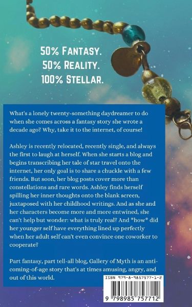 What's a lonely twenty-something daydreamer to do when she comes across a fantasy story she wrote a decade ago? Why, take it to the internet, of course! Ashley is recently relocated, recently single, and always the first to laugh at herself. When she starts a blog and begins transcribing her tale of star travel onto the internet, her only goal is to share a chuckle with a few friends. But soon, her blog posts cover more than constellations and rare words. Ashley finds herself spilling her inner thoughts onto the blank screen, juxtaposed with her childhood writings. And as she and her characters become more and more entwined, she can't help but wonder: what is truly real? And *how* did her younger self have everything lined up perfectly when her adult self can't even convince one coworker to cooperate? Part fantasy, part tell-all blog, Gallery of Myth is an anti-coming-of-age story that's at times amusing, angry, and out of this world.