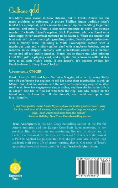 All that glitters isn't gold on Franki's steamboat investigation... It's Mardi Gras season in New Orleans, but PI Franki Amato has too many problems to celebrate. A proven Sicilian lemon tradition hasn't landed her a proposal, so her nonna has amped up the meddling to get her married, and pronto. Franki's also under pressure to solve the strange murder of a family friend's nephew, Nick Pescatore, who was found on a Mississippi River steamboat rumored to be haunted. When the sinister old boat sets sail on an overnight gambling cruise, Franki goes undercover with a motley crew, including a Mark Twainophile captain with a murderous past and a slimy galley chef with a mobster brother, not to mention an ex-stripper landlady with a newfound career as a memoir writer and all-too public speaker. Franki has to figure out what missing Civil War gold, a playing card, and a mysterious woman on roller skates have to do with Nick's death. If she doesn't, it's anchors aweigh for Franki-down to Davy Jones' locker. Galliano Gold is book 5 in the Franki Amato Mysteries, but if can be read as a standalone. If you like zany characters and laugh-out-loud humor with a splash of suspense, then you'll drink up this fun series by USA Today Bestselling Author Traci Andrighetti. Cheers! BONUS SHORT MYSTERY (hardcover edition only): Cremoncello Cream (Franki Amato Mysteries 5.5) Franki Amato's BFF and boss, Veronica Maggio, takes her to sunny Sicily for a PI conference but neglects to tell her about their teambuilder, a trek up Mount Etna. And the volcano isn't the only earth-shattering surprise in store for Franki. Next her engagement ring is stolen, and then she learns her life is in danger. She has to find out who took the ring, and why people on the island seem to know her. If she doesn't, she could end up in hot lava-literally. FRANKI AMATO MYSTERIES: Limoncello Yellow (book 1) Prosecco Pink (book 2) Amaretto Amber (book 3) Campari Crimson (book 4) Galliano Gold (book 5) Marsala Maroon (book 6) Valpolicella Violet (book 7) Tuaca Tan (book 8) Nocino Noir (book 9) Braulio Brown (Thanksgiving novella) Sambuca Scarlet (book 10)