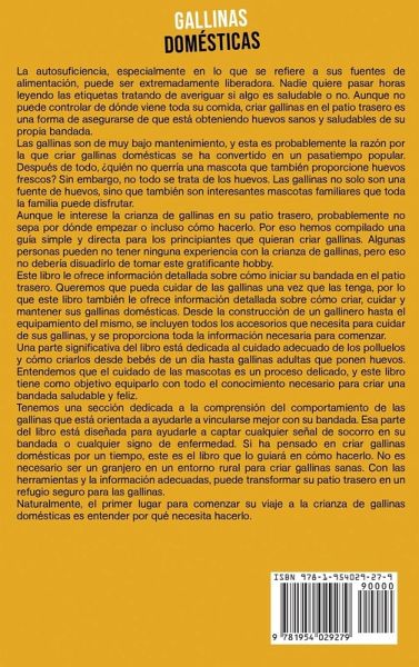 ¿Busca una guía sencilla para criar gallinas domésticas? ¿Desea consejos simples y eficaces para encontrar las razas adecuadas para su bandada de traspatio? Si su respuesta es afirmativa, entonces este libro, Gallinas domésticas, es justo lo que ha estado buscando. Esta es una guía para principiantes que lo llevará a través de los fundamentos de la crianza de gallinas, incluyendo:Cosas que hay que considerar antes de criar gallinas Dónde comprar sus gallinas Qué razas son mejores para diferentes propósitos Tiene consejos prácticos sobre qué buscar cuando se compran gallinas para su patio trasero. Hay mucha información sobre cómo identificar aves sanas para asegurar que solo compre las mejores existencias para su patio. Gallinas domésticas entra en todos los pequeños detalles que ayudarán a que su bandada de traspatio sea un éxito. Este libro le guiará en la preparación de su traspatio para su bandada, así como en la elección de la mejor ubicación en su patio trasero para un gallinero. Si no tiene ni idea de por dónde empezar a construir un gallinero, se le proporcionará un proceso paso a paso para que lo utilice cuando construya un simple gallinero. También hay información adicional sobre:Cuánto espacio necesitará para sus gallinas Ordenanzas y leyes locales sobre la cría de gallinas domésticas. Y cuánto le costará mantenerlos y conservarlos Desmitificamos los distintos tipos de alimento para gallinas y le damos toda la información necesaria sobre el mejor alimento para sus gallinas, cuándo alimentarlas, cómo alimentarlas e incluso con qué frecuencia debe hacerlo. Para el principiante que quiere criar gallinas para un propósito específico, no hay necesidad de preocuparse, este libro le llevará a través de:Cómo alimentar y cuidar a las gallinas y a los polluelos Cómo alimentar y cuidar a las gallinas ponedoras Cómo alimentar y cuidar a las gallinas de tipo broiler Además, todos los detalles que necesita saber cuándo se trata de las mejores prácticas de alimentación Una parte significativa de este libro está dedicada a guiarles en el mantenimiento y cuidado de sus gallinas. Hay herramientas útiles para ayudar a sus aves a hacer frente a las condiciones adversas, qué hacer durante el invierno, y cómo puede conseguir que sus ponedoras sean más productivas. Hay muchos consejos sobre la higiene, el mantenimiento de los gallineros limpios, y cómo detectar signos de mala salud en sus gallinas. Toda esta información está incluida en un paquete con prácticos consejos de bricolaje. Este libro tiene una sección entera dedicada a las enfermedades comunes de las aves de corral que afectan a las gallinas domésticas y cómo tratar estas condiciones. Si desea criar gallinas y no tiene ni idea de por dónde empezar, Gallinas domésticas es la guía definitiva para principiantes. Este libro es una guía práctica que tiene como objetivo equiparlo para comenzar su pasatiempo de criar gallinas domésticas, mantener gallinas felices y saludables, y obtener la mejor producción de sus gallinas. ¡Obtenga este libro ahora para aprender más acerca de las gallinas domésticas!