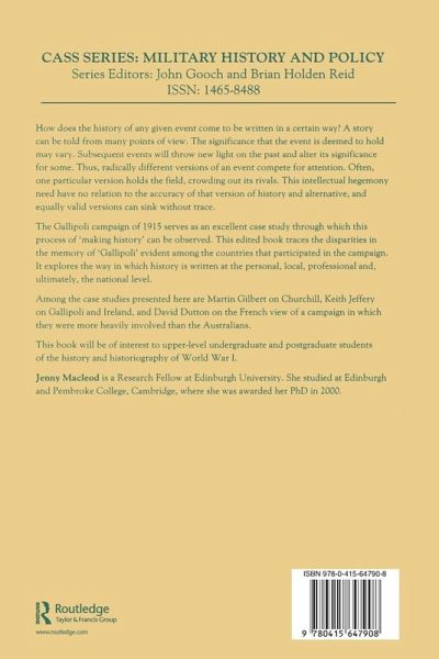 This new book traces the disparities in the memory of Gallipoli that are evident in the countries that participated in the campaign. It explores the way in which history is written at the personal, local, professional, and national levels. This study tackles key questions about just how the history of any given event comes to be written in a certain way and how very different versions of an event can compete for attention. Often one particular version holds the field drowning out its rivals. The Gallipoli campaign of 1915 serves as an excellent case study through which the process of 'making history' can be observed. Among the case studies are Martin Gilbert on Churchill, Keith Jeffery on Gallipoli and Ireland, and David Dutton on the French view of a campaign in which they were more heavily involved than the Australians. Christopher Pugsley uncovers the reality behind the myths of Anzac, and Keith Grieves writes on the local commemoration of the campaign in Sussex. Other chapters consider the writing of unit histories, the professional study of the campaign in the development of amphibious warfare, the romance of the British cultural history of Gallipoli, and the shifts that are evident in the portrayal of Anzacs in Australian cinema.
