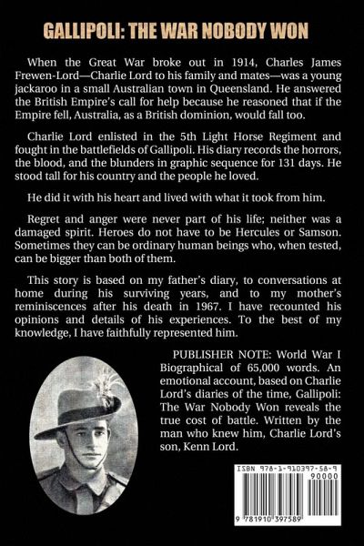 When the Great War broke out in 1914, Charles James Frewen-Lord-Charlie Lord to his family and mates-was a young jackaroo in a small Australian town in Queensland. He answered the British Empire's call for help because he reasoned that if the Empire fell, Australia, as a British dominion, would fall too. Charlie Lord enlisted in the 5th Light Horse Regiment and fought in the battlefields of Gallipoli. His diary records the horrors, the blood, and the blunders in graphic sequence for 131 days. He stood tall for his country and the people he loved. He did it with his heart and lived with what it took from him. Regret and anger were never part of his life; neither was a damaged spirit. Heroes do not have to be Hercules or Samson. Sometimes they can be ordinary human beings who, when tested, can be bigger than both of them. This story is based on my father's diary, to conversations at home during his surviving years, and to my mother's reminiscences after his death in 1967. I have recounted his opinions and details of his experiences. To the best of my knowledge, I have faithfully represented him. PUBLISHER NOTE: World War I Biographical of 65,000 words. An emotional account, based on Charlie Lord's diaries of the time, Gallipoli: The War Nobody Won reveals the true cost of battle. Written by the man who knew him, Charlie Lord's son, Kenn Lord.