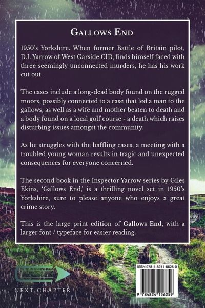 1950's Yorkshire. When former Battle of Britain pilot, D.I. Yarrow of West Garside CID, finds himself faced with three seemingly unconnected murders, he has his work cut out. The cases include a long-dead body found on the rugged moors, possibly connected to a case that led a man to the gallows, as well as a wife and mother beaten to death and a body found on a local golf course - a death which raises disturbing issues amongst the community. As he struggles with the baffling cases, a meeting with a troubled young woman results in tragic and unexpected consequences for everyone concerned. The second book in the Inspector Yarrow series by Giles Ekins, 'Gallows End,' is a thrilling novel set in 1950's Yorkshire, sure to please anyone who enjoys a great crime story. This is the large print edition of Gallows End, with a larger font / typeface for easier reading.