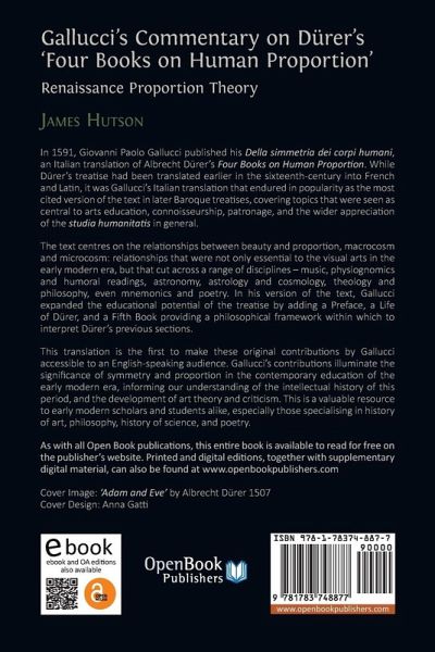 In 1591, Giovanni Paolo Gallucci published his Della simmetria dei corpi humani, an Italian translation of Albrecht Dürer's Four Books on Human Proportion. While Dürer's treatise had been translated earlier in the sixteenth-century into French and Latin, it was Gallucci's Italian translation that endured in popularity as the most cited version of the text in later Baroque treatises, covering topics that were seen as central to arts education, connoisseurship, patronage, and the wider appreciation of the studia humanitatis in general. The text centres on the relationships between beauty and proportion, macrocosm and microcosm: relationships that were not only essential to the visual arts in the early modern era, but that cut across a range of disciplines - music, physiognomics and humoral readings, astronomy, astrology and cosmology, theology and philosophy, even mnemonics and poetry. In his version of the text, Gallucci expanded the educational potential of the treatise by adding a Preface, a Life of Dürer, and a Fifth Book providing a philosophical framework within which to interpret Dürer's previous sections. This translation is the first to make these original contributions by Gallucci accessible to an English-speaking audience. Gallucci's contributions illuminate the significance of symmetry and proportion in the contemporary education of the early modern era, informing our understanding of the intellectual history of this period, and the development of art theory and criticism. This is a valuable resource to early modern scholars and students alike, especially those specialising in history of art, philosophy, history of science, and poetry.