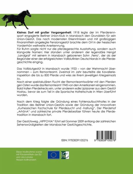 Kleines Dorf mit großer Vergangenheit: 1918 legte der im Pferderennsport engagierte Berliner Union-Klub in Mansbach den Grundstein für sein Union-Gestüt. Das nach modernsten Erkenntnissen angelegte Vollblutgestüt brachte dem Ort in der hessischen Vorderrhön weltweite Anerkennung. Das Gestüt wurde 1933 ¿ von der Wehrmacht übernommen ¿ zum Remonteamt. Zweimal im Jahr beurteilte die Kavallerieinspektion die bis zu 800 Pferde und wies sie ihrem jeweiligen Kriegseinsatz zu. Nach einer spektakulären Flucht der Remonteamtswärter mit den Pferden gen Osten wurde das Remonteamt 1945 von den Amerikanern eingenommen. Bald trafen Pferdetrecks ein, unter anderem edle Lipizzaner aus dem Gestüt Hostau, bevor sie zum Teil in die Spanische Hofreitschule in Wien überführt wurden. Nach dem Krieg folgte die Gründung eines Fohlenaufzuchthofes in der Tradition des Berliner Union-Gestüts sowie der Gründung der innovativen ¿Kurhessischen Fachschule für Pferdezucht und -haltung¿. Der Pferdehof ¿ArhönA¿ und zahlreiche private Pferdebesitzer führen heute die Pferdetradition in Mansbach fort.