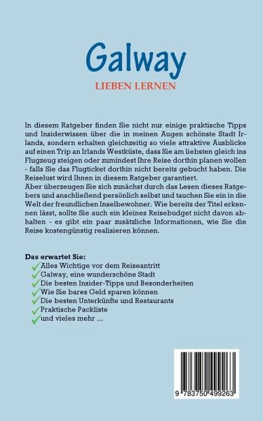 In diesem Ratgeber finden Sie nicht nur einige praktische Tipps und Insiderwissen über die in meinen Augen schönste Stadt Irlands, sondern erhalten gleichzeitig so viele attraktive Ausblicke auf einen Trip an Irlands Westküste, dass Sie am liebsten gleich ins Flugzeug steigen oder zumindest Ihre Reise dorthin planen wollen - falls Sie das Flugticket dorthin nicht bereits gebucht haben. Die Reiselust wird Ihnen in diesem Ratgeber garantiert.Aber überzeugen Sie sich zunächst durch das Lesen dieses Ratgebers und anschließend persönlich selbst und tauchen Sie ein in die Welt der freundlichen Inselbewohner. Wie bereits der Titel erkennen lässt, sollte Sie auch ein kleines Reisebudget nicht davon abhalten - es gibt ein paar zusätzliche Informationen, wie Sie die Reise kostengünstig realisieren können. Das erwartet Sie:-Alles Wichtige vor dem Reiseantritt-Galway, eine wunderschöne Stadt-Die besten Insider-Tipps und Besonderheiten-Wie Sie bares Geld sparen können-Die besten Unterkünfte und Restaurants-Praktische Packliste-und vieles mehr ...