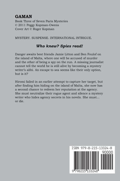 GAMAN Book Three of Seven Paris Mysteries © 2011 Peggy Kopman-Owens Cover Art © Roger Kopman MYSTERY. SUSPENSE. INTERNATIONAL INTRIGUE. Who knew? Spies read! Danger awaits best friends Jamie Litton and Ben Foulof on the island of Malta, where one will be accused of murder and the other of being a spy on the run. A missing journalist cannot tell the world he is still alive by becoming a mystery writer's alibi. An escape to sea seems like their only option, but is it? Hiromi failed in an earlier attempt to capture her target, but after finding him hiding on the island of Malta, she now has a second chance to redeem her reputation at the agency. She must neutralize their rogue agent and silence a mystery writer who hides agency secrets in his novels. She must… or die.