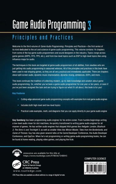 Welcome to the third volume of Game Audio Programming: Principles and Practices-the first series of its kind dedicated to the art and science of game audio programming. This volume contains 14 chapters from some of the top game audio programmers and sound designers in the industry. Topics range across game genres (ARPG, RTS, FPS, etc.), and from low-level topics such as DSP to high-level topics like using influence maps for audio. The techniques in this book are targeted at game audio programmers of all abilities, from newbies who are just getting into audio programming to seasoned veterans. All of the principles and practices in this book have been used in real shipping games, so they are all very practical and immediately applicable. There are chapters about split-screen audio, dynamic music improvisation, dynamic mixing, ambiences, DSPs, and more. This book continues the tradition of collecting modern, up-to-date knowledge and wisdom about game audio programming. So, whether you've been a game audio programmer for one year or ten years, or even if you've just been assigned the task and are trying to figure out what it's all about, this book is for you! Key Features Cutting-edge advanced game audio programming concepts with examples from real game audio engines Includes both high-level and low-level topics Practical code examples, math, and diagrams that you can apply directly to your game audio engine. Guy Somberg has been programming audio engines for his entire career. From humble beginnings writing a low-level audio mixer for slot machines, he quickly transitioned to writing game audio engines for all manner of games. He has written audio engines that shipped AAA games like Hellgate: London, Bioshock 2, The Sims 4, and Torchlight 3, as well as smaller titles like Minion Master, Tales from the Borderlands, and Game of Thrones. Guy has also given several talks at the Game Developer Conference, the Audio Developer Conference, and CppCon. When he's not programming or writing game audio programming books, he can be found at home reading, playing video games, and playing the flute.