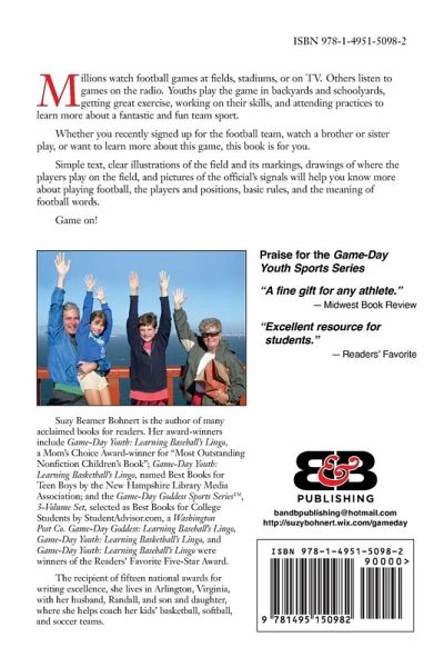 Millions watch football games at fields, stadiums, or on TV. Others listen to games on the radio. Youths play the game in backyards and schoolyards, getting great exercise, working on their skills, and attending practices to learn more about a fantastic and fun team sport. Whether you recently signed up for the football team, watch a brother or sister play, or want to learn more about this game, this book is for you. Simple text, clear illustrations of the field and its markings, drawings of where the players play on the field, and pictures of the official's signals will help you know more about playing football, the players and positions, basic rules, and the meaning of football words. Game on!