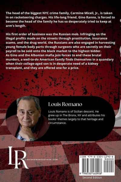 The head of the biggest NYC crime family, Carmine Miceli, Jr., is taken in on racketeering charges. His lifelong friend, Gino Ranno, is forced to become the head of the family he has so desperately tried to keep at arm's length in this third book of Louis Romano's Gino Ranno mob series (FISH FARM, BESA). The first order of business: The Russian mob. Infringing on the illegal profits made on the streets through prostitution, insurance scams, and the drug world, the Russians are also engaged in harvesting young female body parts through surgeons who are secretly on their payroll to be sold onto the black market to the highest bidder. As Gino and the Albanian mafia join forces to end these brutal murders, a well-to-do American family finds themselves in a quandary when their college-aged son is in desperate need of a kidney transplant, and they are offered one for a price. How far will they go to save their son? Drawn into their high-stakes game... A GAME OF PAWNS ... Gino soon comes to the heart-pounding realization that his life and a slew of people he's known for years are dependent upon him to keep them safe, and any of his decisions now will determine whether he, his friends, and associates live or die. The Gino Ranno series: The streets of NYC are getting increasingly narrow as the different nationalities of mob families want more than their fair share of illegal, money-making activities. In FISH FARM, it was the mafia vs. the Colombian drug lords. In the 5-time award-winning BESA, the Albanians start an inner mob war when one of their own is shot during a drug deal gone bad, and now the Russians, who think they can muscle their way into Gino's backyard. Louis Romano's extensive hands-on research for GAME OF PAWNS has been compared to a Patricia Cornwell novel for its accuracy.
