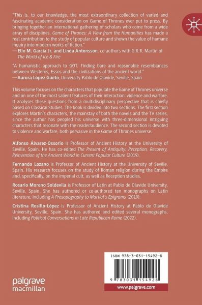 This book focuses on the characters that populate the Game of Thrones universe and on one of the most salient features of their interaction: violence and warfare. It analyses these questions from a multidisciplinary perspective that is chiefly based on Classical Studies. The book is divided into two sections. The first section explores Martin's characters as the mainstay of both the novels and the TV series, since the author has peopled his universe with three-dimensional intriguing characters that resonate with the reader/audience. The second section is devoted to violence and warfare, both pervasive in the Game of Thrones universe. In particular, the TV series' depiction of violence is explicit, going beyond the limits that have seldom been traversed in primetime television i.e. the execution of Ned Stark, the "Red Wedding" and "Battle of the Bastards". In the Game of Thrones universe, violence is not only restricted to warfare but is an everyday occurrence, a result of the social and gender inequalities characterising the world created by Martin.