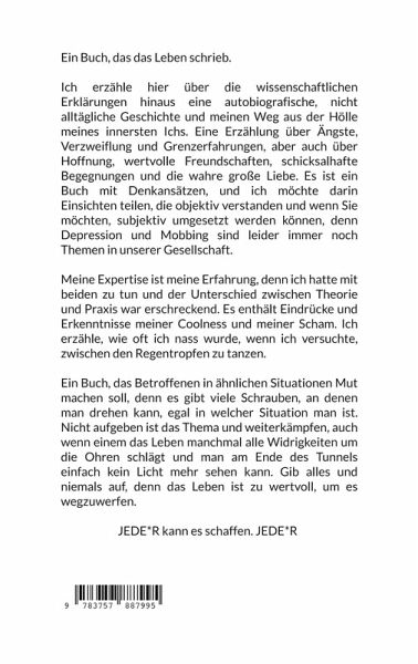 Ich erzähle hier über die wissenschaftlichen Erklärungen hinaus eine autobiografische, nichtalltägliche Geschichte und meinen Weg aus der Hölle meines innersten Ichs. Eine Erzählung über Ängste, Verzweiflung und Grenzerfahrungen, aber auch über Hoffnung, wertvolle Freundschaften, schicksalhafte Begegnungen und die wahre große Liebe. Es ist ein Buch mit Denkansätzen, und ich möchte darin Einsichten teilen, die objektiv verstanden und wenn Sie möchten, subjektiv umgesetzt werden können, denn Depression und Mobbing sind leider immer noch Themen in unserer Gesellschaft.Meine Expertise ist meine Erfahrung, denn ich hatte mit beiden zu tun und der Unterschied zwischen Theorie und Praxis war erschreckend. Es enthält Eindrücke und Erkenntnisse meiner Coolness und meiner Scham. Ich erzähle, wie oft ich nass wurde, wenn ich versuchte, zwischen den Regentropfen zu tanzen. Ein Buch, das Betroffenen in ähnlichen Situationen Mut machen soll, denn es gibt viele Schrauben, an denen man drehen kann, egal in welcher Situation man ist. Nicht aufgeben ist das Thema und weiterkämpfen, auch wenn einem das Leben manchmal alle Widrigkeiten um die Ohren schlägt und man am Ende des Tunnels einfach kein Licht mehr sehen kann. Gib alles und niemals auf, denn das Leben ist zu wertvoll, um es wegzuwerfen.JEDE_R kann es schaffen. JEDE_R