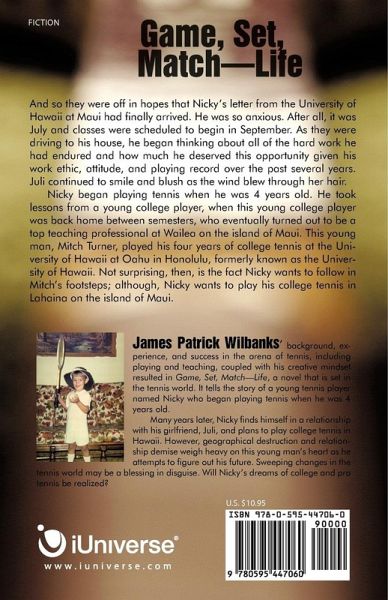 James Patrick Wilbanks' background, experience, and success in the arena of tennis, including playing and teaching, coupled with his creative mindset resulted in Game, Set, Match-Life, a novel that is set in the tennis world. It tells the story of a young tennis player named Nicky who began playing tennis at the early age of four. Many years later, he finds himself in a relationship with his girlfriend, Juli, and plans to play college tennis in Hawaii. However, geographical destruction and relationship demise weigh heavy on this young man's heart as he attempts to figure out his future. Sweeping changes in the tennis world may be a blessing in disguise. Will Nicky's dreams of college and pro tennis be realized?