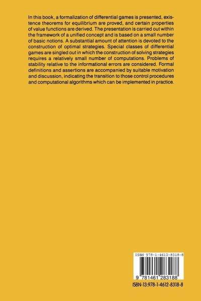 1. Game-Theoretical Control.- 1.1 Minimax Control Problems.- 1.2 Equations of Motion.- 1.3 Positional Strategies.- 1.4 Quality Criterion.- 1.5 Differential Games.- 2. Differential Game of Approach-Evasion.- 2.1 Game-Theoretical Problems of Approach and Evasion.- 2.2 Stable Bridges.- 2.3 Local Estimates.- 2.4 Extremal Strategies.- 2.5 Construction of Stable Bridges.- 3. Existence of the Value for a Positional Differential Game.- 3.1 A Differential Game with a Fixed Termination Time.- 3.2 Differential Games of Pursuit-Evasion.- 3.3 Differential Games with a Bounded Duration.- 3.4 Value Function.- 3.5 Examples.- 4. Dynamic Programming.- 4.1 The Main Equation for a Smooth Value Function.- 4.2 Properties of Value Functions.- 4.3 Directional Differentiability.- 4.4 Generalization of the Main Equation.- 4.5 Examples.- 5. Extremal Aiming.- 5.1 Programmed Maximin and Programmed Absorption.- 5.2 Extremal Aiming in Linear Controlled Systems.- 5.3 Extremal Aiming in Problems of Pursuit and Evasion.- 5.4 Regularity Conditions for a Programmed Maximin.- 5.5 Differentiability of the Value Function and Regularity Condition for the Programmed Maximin.- 6. Extremal Aiming for Nonlinear Differential Games.- 6.1 Generalized Programmed Controls.- 6.2 Programmed Maximin.- 6.3 The Minimum Principle and Maximin Rule.- 6.4 Directional Derivatives of Functions of a Programmed Maximin.- 6.5 Stability Conditions for the Programmed Maximin.- 7. Prior Stable Sets.- 7.1 Prior Stable Path.- 7.2 Stable Integral Manifolds.- 7.3 Prior Stable Sets for a Linear System.- 7.4 Comparison of Controlled Systems.- 8. Qualitative Problems in the Theory of Differential Games.- 8.1 The Problem of Stability of Solutions.- 8.2 Guidance Control.- 8.3 Stabilization of Solutions of Game-Theoretical Control Problems.- 8.4 Evasion on an Infinite Time Interval.- 8.5 Universal Optimal Strategies.- 9. Mixed Strategies in Differential Games.- 9.1 Deterministic and Stochastic Controls.- 9.2 Mixed Strategies.- 9.3 Dynamic Programming, Extremal Aiming, and A Priori Stable Sets.- 9.4 Approximation of Mixed Strategies.- 9.5 Stochastic Control with Guidance.- 10. Lower and Upper Differential Games.- 10.1 Counterstrategies.- 10.2 Alternatives.- 10.3 Efficient Solutions of Lower and Upper Differential Games.- 10.4 Control Procedures with Guidance.- 10.5 Unification of Differential Games.- 11. Differential-Functional Games.- 1.1 Strategies with Complete Memory.- 1.2 Stable Functionals.- 1.3 The Saddle Point.- 1.4 Properties of Value Functionals.- A.l. Semi-Continuous Functions.- A.2. Convex Functions.- A.3. Multivalued Mappings.- A.4. Differential Inclusions.