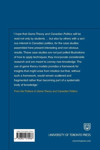 This is the first book-length application of game theory to Canadian politics. It uses a series of case studies to illustrate fundamental concepts of game theory such as two-person and n-person games; solution in mixed strategies; ordinal games; Nash equilibrium; coordination, Assurance, Chicken and Prisoner's Dilemma models; Schelling curves; coalition theory and Riker's size principle; voting rules, cycles, and the Condorcet winner; the Banzhaf power index; structure-induced equilibrium; and spatial models of political conflict. No mathematics more complex than simple algebra is required to follow the exposition. The case studies are not just contrived illustrations of abstract models but intensively researched studies of important episodes in Canadian politics. Topics include the Lubicon Lake stalemate, metrification and vaccination; the size of winning coalitions; formulas for amending the Canadian constitution; the mechanics of choosing party leaders; Parliament's failure to legislate on abortion after the Morgentaler decision; and the entry of the Reform Party into the political system. In each case, utilization of game-theory models produces new and sometimes surprising conclusions. Game theory, and the rational-choice paradigm of which it is a part, are an increasingly important addition to the conventional modes of political analysis. This book is intended to show what game theory can add to the philosophical, institutional, and behavioural approaches that have dominated previous works on Canadian politics.