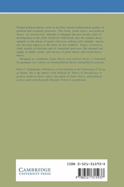 Formal political theory seeks to develop formal, mathematical models of political and economic processes. This book attempts to integrate the last twenty years of development in this field. Professor Ordeshook uses the modern developments in the theory of games (decision making with multiple, interactive decision makers) as the basis for the synthesis. Topics covered include models of elections and of committee processes, the demand and supply of public goods, and surveys of game theory and social-choice theory. Game Theory and Political Theory is designed as a textbook for graduate courses in formal political theory and political economy.