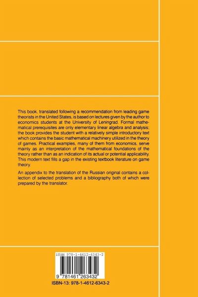 The basis for this book is a number of lectures given frequently by the author to third year students of the Department of Economics at Leningrad State University who specialize in economical cybernetics. The main purpose of this book is to provide the student with a relatively simple and easy-to-understand manual containing the basic mathematical machinery utilized in the theory of games. Practical examples (including those from the field of economics) serve mainly as an interpretation of the mathematical foundations of this theory rather than as indications of their actual or potential applicability. The present volume is significantly different from other books on the theory of games. The difference is both in the choice of mathematical problems as well as in the nature of the exposition. The realm of the problems is somewhat limited but the author has tried to achieve the greatest possible systematization in his exposition. Whenever possible the author has attempted to provide a game-theoretical argument with the necessary mathematical rigor and reasonable generality. Formal mathematical prerequisites for this book are quite modest. Only the elementary tools of linear algebra and mathematical analysis are used.