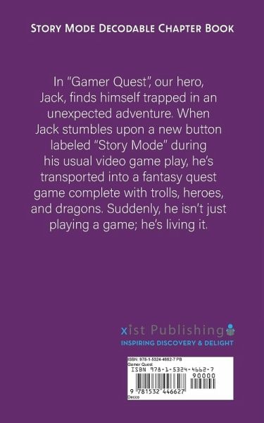 Gamer Quest is a thrilling addition to the ""Story Mode"" series - a collection of decodable chapter books designed for beginning readers from grades 2-6. In this series, children just starting to read can sharpen their reading skills with simple words, all the while enjoying the high-stakes plots set in the fascinating world of video games. In ""Gamer Quest"", our hero, Jack, finds himself trapped in an unexpected adventure. When Jack stumbles upon a new button labeled ""Story Mode"" during his usual video game play, he's transported into a fantasy quest game complete with trolls, heroes, and dragons. Suddenly, he isn't just playing a game; he's living it. In each chapter, Jack encounters exciting challenges and battles fierce adversaries. Along the way, young readers have the chance to decode words and recognize essential phonics patterns, such as the ll, le, and al sounds. By mastering these phonetic elements, readers will enhance phonemic awareness, improve reading accuracy, and boost fluency and comprehension. Whether your young readers is an avid gamer or simply loves a good adventure, ""Gamer Quest"" offers a unique blend of entertainment and educational value. This chapter book is the perfect companion for young readers who want to enhance their reading skills while embarking on an epic virtual quest. Join Jack as he conquers challenges, defeats foes, and discovers the incredible power of reading. Are you ready to embark on the ultimate quest?