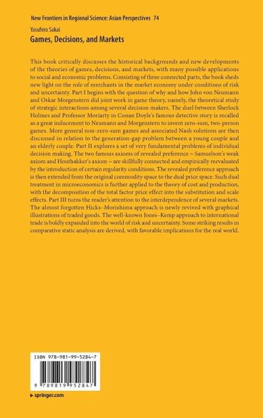 This book critically discusses the historical backgrounds and new developments of the theories of games, decisions, and markets, with many possible applications to social and economic problems. Consisting of three connected parts, the book sheds new light on the role of merchants in the market economy under conditions of risk and uncertainty. Part I begins with the question of why and how John von Neumann and Oskar Morgenstern did joint work in game theory, namely, the theoretical study of strategic interactions among several decision makers. The duel between Sherlock Holmes and Professor Moriarty in Conan Doyle's famous detective story is recalled as a great inducement to Neumann and Morgenstern to invent zero-sum, two-person games. More general non-zero-sum games and associated Nash solutions are then discussed in relation to the generation-gap problem between a young couple and an elderly couple. Part II explores a set of very fundamental problems of individual decision making. Thetwo famous axioms of revealed preference Samuelson's weak axiom and Houthakker's axiom are skillfully connected and empirically reevaluated by the introduction of certain regularity conditions. The revealed preference approach is then extended from the original commodity space to the dual price space. Such dual treatment in microeconomics is further applied to the theory of cost and production, with the decomposition of the total factor price effect into the substitution and scale effects. Part III turns the reader's attention to the interdependence of several markets. The almost forgotten Hicks-Morishima approach is newly revived with graphical illustrations of traded goods. The well-known Jones-Kemp approach to international trade is boldly expanded into the world of risk and uncertainty. Some striking results in comparative static analysis are derived, with favorable implications for the real world.