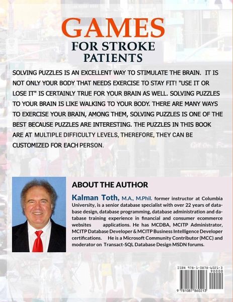 Most stroke patients will benefit from this book full of entertaining games, quizzes, puzzles and coloring pages. Make your mind younger, improve short & long-term memory, and stimulate logic & comprehension. This is an essential fun book for restoring and maintaining a vibrant brain. Beside stroke brain therapy, this book is also excellent for adult career advancement and for kids to excel in school. Advanced games & math drills not only benefit stroke victims, but Parkinson’s & Alzheimer’s patients as well. Best printed book resource for caregivers, therapists and nursing homes. Hundreds of interesting, different kind words, language, logic, math & picture puzzles. The book also features grown-up (adult) coloring pages to improve fine motor skills & hands dexterity. Puzzles in this book have interesting & engaging content to keep the reader hooked. Word search, brainteasers, crosswords, quizzes, Sudoku & Hollywood trivia. Enjoyable, captivating, fun picture-in-the-middle word find puzzles. Live Active Happy Life!
