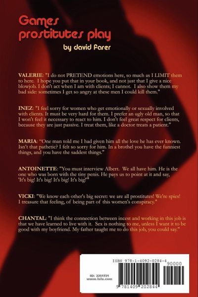 What prostitutes do, how they do it, and the many roles prostitution plays in their lives. Each woman has her own approach. This book assumes that prostitutes are people who have dignity and feelings, and that they are neither stupid nor pitiful. They speak here as individuals who suffered greatly as children, but who view themselves as fighting back and dominating men as prostitutes. Role-playing is central to prostitution, for prostitutes and their clients. A lonely, boring man can become a hero, and an ordinary woman plays his love goddess, or his psychiatrist. Each prostitute has her own chapter; other chapters explain brothel-management, describe the brothel's owner, and demystify prostitutes' sexual techniques. This book is a direct, no-nonsense look at prostitution. Some parts will make you laugh; others can bring tears from a rock.