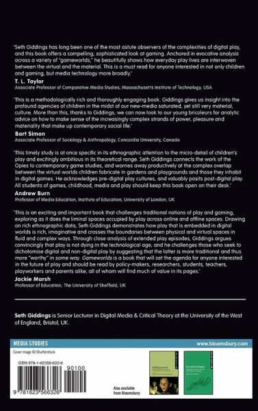 Game studies is a rapidly developing field across the world, with a growing number of dedicated courses addressing video games and digital play as significant phenomena in contemporary everyday life and media cultures. Seth Giddings looks to fill a gap by focusing on the relationship between the actual and virtual worlds of play in everyday life. He addresses both the continuities and differences between digital play and longer-established modes of play. The 'gameworlds' title indicates both the virtual world designed into the videogame and the wider environments in which play is manifested: social relationships between players; hardware and software; between the virtual worlds of the game and the media universes they extend (e.g. Pokémon, Harry Potter, Lego, Star Wars); and the gameworlds generated by children's imaginations and creativity (through talk and role-play, drawings and outdoor play). The gameworld raises questions about who, and what, is in play. Drawing on recent theoretical work in science and technology studies, games studies and new media studies, a key theme is the material and embodied character of these gameworlds and their components (players' bodies, computer hardware, toys, virtual physics, and the physical environment). Building on detailed small-scale ethnographic case studies, Gameworlds is the first book to explore the nature of play in the virtual worlds of video games and how this play relates to, and crosses over into, everyday play in the actual world.