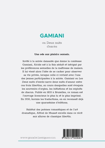 Une ode aux plaisirs sexuels. POUR UN PUBLIC AVERTI. Invité à la soirée dansante que donne la comtesse Gamiani, Alcide est à la fois séduit et intrigué par les préférences sexuelles de la maîtresse de maison. Il lui vient alors l'idée de se cacher pour observer sa vie privée, lorsque celle-ci revient avec l'une des jeunes participantes à la soirée. Gamiani ou Les Deux nuits d'excès narre deux nuits d'amour entre ces trois libertins, au cours desquelles sont évoqués les souvenirs d'orgies, les initiations et les exploits de chacun. Publié en 1833 à Bruxelles, ce roman est l'ouvrage licencieux le plus lu et le plus imprimé. En 1930, hormis les traductions, on en recensait déjà une quarantaine d'éditions. Habitué des poèmes romantiques et de l'art dramatique, Alfred de Musset excelle dans ce récit aux allures de classique libertin. EXTRAIT Minuit sonnait, et les salons de la comtesse Gamiani resplendissaient encore de l¿éclat des lumières. Les rondes, les quadrilles s¿animaient, s¿emportaient aux sons d¿un orchestre enivrant. Les toilettes étaient merveilleuses, les parures étincelaient. Gracieuse, empressée, la maîtresse du bal semblait jouir du succès d¿une fête préparée, annoncée à grands frais. On la voyait sourire agréablement à tous les mots flatteurs, aux paroles d¿usage que chacun lui prodiguait pour payer sa présence. Renfermé dans mon rôle habituel d¿observateur, j¿avais déjà fait plus d¿une remarque qui me dispensait d¿accorder à la comtesse Gamiani le mérite qüon lui supposait. Comme femme du monde, je l¿eus bientôt jugée, il me restait à disséquer son être moral, à porter le scalpel dans les régions du coeur ; et je ne sais quoi d¿étrange, d¿inconnu, me gênait, m¿arrêtait dans mon examen. J¿éprouvais une peine infinie à démêler le fond de l¿existence de cette femme, dont la conduite n¿expliquait rien. Jeune encore avec une immense fortune, jolie au goût du grand nombre, cette femme sans parents, sans amis avoués, s¿était en quelque sorte individualisée dans le monde. Elle dépensait seule, une existence capable, en toute apparence, de supporter plus d¿un partage. Bien des langues avaient glosé, finissant toujours par médire ; mais, faute de preuves, la comtesse demeurait impénétrable. À PROPOS DE L'AUTEUR Alfred de Musset (1810-1857) est un poète et dramaturge français de la période romantique. Lycéen brillant, il abandonne rapidement ses études de droit et de médecine pour se consacrer entièrement à la littérature, et mener une vie de dandy. Entre À quoi rêvent les jeunes filles ? (1832), Les Caprices de Marianne (1833) et son chef-d'¿uvre Lorenzaccio, le jeune écrivain fougueux rédige le texte non signé de Gamiani ou Deux nuits d'excès. L'attribution du récit érotique à Alfred de Musset a été longtemps contestée et sera rendue officielle seulement après sa mort. À PROPOS DE LA COLLECTION Retrouvez les plus grands noms de la littérature érotique dans notre collection Grands classiques érotiques. Autrefois poussés à la clandestinité et relégués dans « l'Enfer des bibliothèques », les auteurs de ces ¿uvres incontournables du genre sont aujourd'hui reconnus mondialement. Du Marquis de Sade à Alphonse Momas et ses multiples pseudonymes, en passant par le lyrique Alfred de Musset ou la féministe Renée Dunan, les Grands classiques érotiques proposent un catalogue complet et varié qui contentera tant les novices que les connaisseurs.