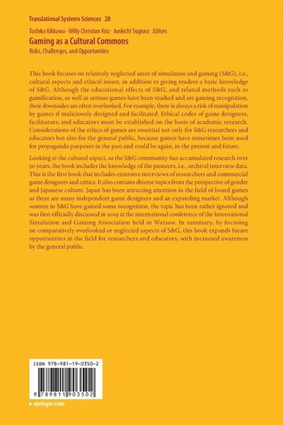 This book focuses on relatively neglected areas of simulation and gaming (S&G), i.e., cultural aspects and ethical issues, in addition to giving readers a basic knowledge of S&G. Although the educational effects of S&G, and related methods such as gamification, as well as serious games have been studied and are gaining recognition, their downsides are often overlooked. For example, there is always a risk of manipulation by games if maliciously designed and facilitated. Ethical codes of game designers, facilitators, and educators must be established on the basis of academic research. Considerations of the ethics of games are essential not only for S&G researchers and educators but also for the general public, because games have sometimes been used for propaganda purposes in the past and could be again, in the present and future. Looking at the cultural aspect, as the S&G community has accumulated research over 50 years, the book includes the knowledge of the pioneers, i.e., archival interview data. This is the first book that includes extensive interviews of researchers and commercial game designers and critics. It also contains diverse topics from the perspective of gender and Japanese culture. Japan has been attracting attention in the field of board games as there are many independent game designers and an expanding market. Although women in S&G have gained some recognition, the topic has been rather ignored and was first officially discussed in 2019 at the international conference of the International Simulation and Gaming Association held in Warsaw. In summary, by focusing on comparatively overlooked or neglected aspects of S&G, this book expands future opportunities in the field for researchers and educators, with increased awareness by the general public.