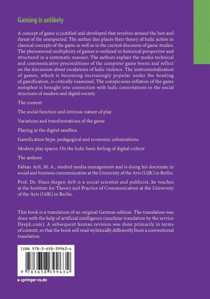 A concept of game is justified and unfolded that revolves around the lure and threat of the unexpected. The author duo places their theory of ludic action in classical concepts of the game as well as in the current discourse of game studies. The phenomenal multiplicity of games is outlined in historical perspective and structured in a systematic manner. The authors explain the media-technical and communicative preconditions of the computer game boom and reflect on the discussion about escalations of ludic violence. The instrumentalization of games, which is becoming increasingly popular under the heading of gamification, is critically examined. The conspicuous inflation of the game metaphor is brought into connection with ludic connotations in the social structures of modern and digital society.