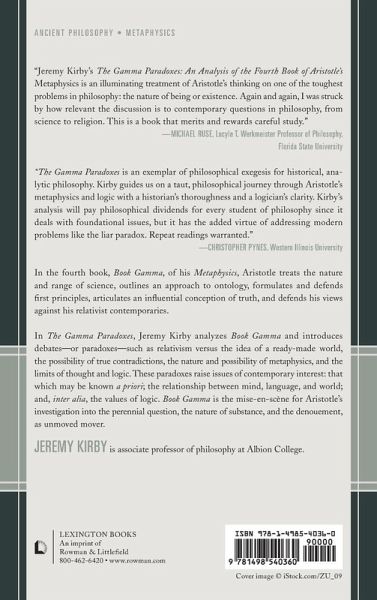 In this book, Jeremy Kirby analyzes Book Gamma of Aristotle's Metaphysics and introduces the debates (or paradoxes as he refers to them) such as relativism versus the idea of a ready-made world, the possibility of true contradictions, the nature and possibility of metaphysics, the limits of thought, and logic.