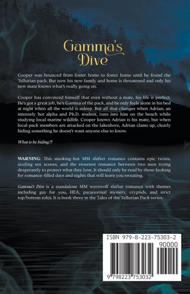Cooper never had a place to call home until he found the Tellurian pack. But now his new family is threatened by a mysterious lake monster and only his new mate knows what's really going on. Cooper has convinced himself that even without a mate, his life is perfect. He's got a great job, he's Gamma of the pack, and he only feels alone in his bed at night when all the world is asleep. But all that changes when Adrian, an intensely hot alpha and Ph.D. student, runs into him on the beach while studying local marine wildlife. Cooper knows Adrian is his mate, but when local pack members are attacked on the lakeshore, Adrian clams up, clearly hiding something he doesn't want anyone else to know. What is he hiding?! WARNING: This smoking-hot MM shifter romance contains epic twists, sizzling sex scenes, and the sweetest romance between two men trying desperately to protect what they love. It should only be read by those looking for romance-filled days and nights that will leave you sweating. Gamma's Dive is a standalone MM werewolf shifter romance with themes including gay for you, HEA, paranormal mystery, cryptids, and strict top/bottom roles. It is book three in the Tales of the Tellurian Pack series.