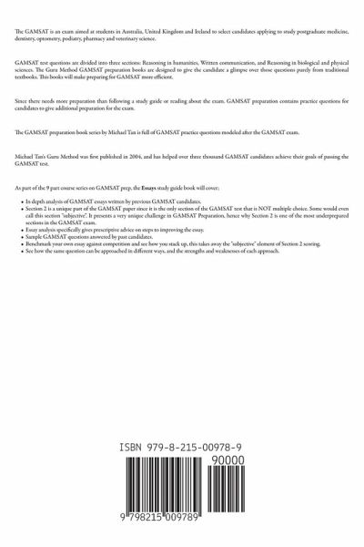 The GAMSAT is an exam aimed at students in Australia, United Kingdom and Ireland to select candidates applying to study postgraduate medicine, dentistry, optometry, podiatry, pharmacy and veterinary science. GAMSAT test questions are divided into three sections: Reasoning in humanities, Written communication, and Reasoning in biological and physical sciences. The Guru Method GAMSAT preparation books are designed to give the candidate a glimpse over those questions purely from traditional textbooks. This books will make preparing for GAMSAT more efficient. Since there needs more preparation than following a study guide or reading about the exam. GAMSAT preparation contains practice questions for candidates to give additional preparation for the exam. The GAMSAT preparation book series by Michael Tan is full of GAMSAT practice questions modeled after the GAMSAT exam. Michael Tan's Guru Method was first published in 2004, and has helped over three thousand GAMSAT candidates achieve their goals of passing the GAMSAT test. As part of the 9 part course series on GAMSAT prep, the Essays study guide book will cover;In depth analysis of GAMSAT essays written by previous GAMSAT candidates. Section 2 is a unique part of the GAMSAT paper since it is the only section of the GAMSAT test that is NOT multiple choice. Some would even call this section "subjective". It presents a very unique challenge in GAMSAT Preparation, hence why Section 2 is one of the most underprepared sections in the GAMSAT exam. Essay analysis specifically gives prescriptive advice on steps to improving the essay. Sample GAMSAT questions answered by past candidates. Benchmark your own essay against competition and see how you stack up, this takes away the "subjective" element of Section 2 scoring. See how the same question can be approached in different ways, and the strengths and weaknesses of each approach.