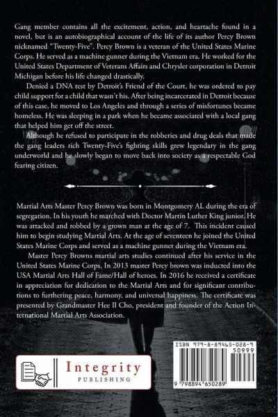 Gang member contains all the excitement, action, and heartache found in a novel, but is actually an autobiographical account of the life of its author Percy Brown nicknamed "Twenty-Five". Percy Brown is a veteran of the United States Marine Corps. He served as a machine gunner during the Vietnam era. He worked for the United States Department of Veterans Affairs and Chrysler corporation in Detroit Michigan before his life changed decisively. Denied a DNA test by Detroit's Friend of the Court, he was ordered to pay child support for a child that wasn't his. After being incarcerated in Detroit because of this case, he moved to Los Angeles and through a series of misfortunes became homeless. He was sleeping in a park when he became associated with a local gang that helped him get off the street. Although he refused to participate in the robberies and drug deals that made the gang leaders rich Twenty-Five's fighting skills grew legendary in the gang underworld and he slowly began to move back into society as a respectable God fearing citizen.