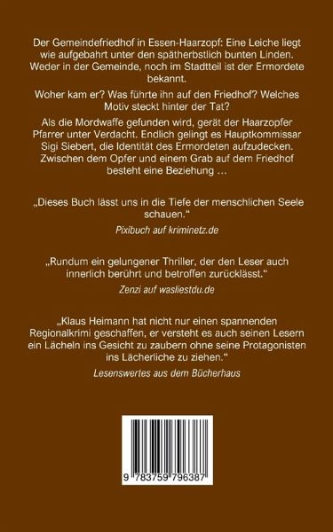 auf einer geräumten Grabstelle liegt und die keiner zu kennen scheint.Kommissar Sigi Siebert geht…mehrAuf den Krimi Gang zum Friedhof von Klaus Heimann wurde ich durch den Verlag Edition Oberkassel aufmerksam. Ich habe es als Taschenbuch mit 239 Seiten gelesen. Die einzelnen Kapitel tragen jeweils eine Überschrift passend zum Inhalt.