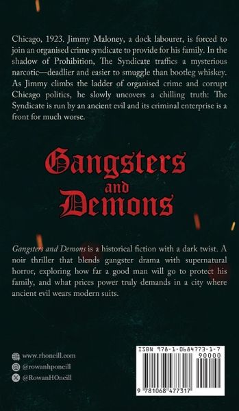Chicago, 1923. Jimmy Maloney, a dock labourer, is forced to join an organised crime syndicate to provide for his family. In the shadow of Prohibition, The Syndicate traffics a mysterious narcotic-deadlier and easier to smuggle than bootleg whiskey. As Jimmy climbs the ladder of organised crime and corrupt Chicago politics, he slowly uncovers a chilling truth: The Syndicate is run by an ancient evil and its criminal enterprise is a front for much worse. Gangsters and Demons is a historical fiction with a dark twist. A noir thriller that blends gangster drama with supernatural horror, exploring how far a good man will go to protect his family, and what prices power truly demands in a city where ancient evil wears modern suits.