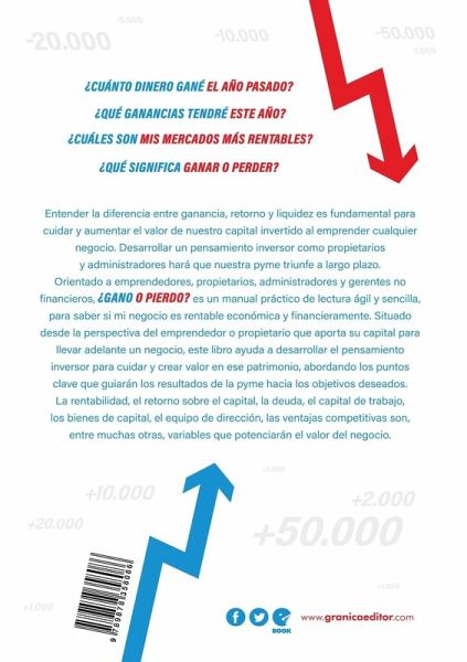 ¿Cuánto dinero gané el año pasado? ¿Cuáles son mis mercados más rentables? ¿Cuánto serán mis ganancias este año? ¿Qué significa ganar o perder? Entender la diferencia entre ganancia, retorno y liquidez es fundamental para cuidar y aumentar el valor de nuestro capital invertido al emprender cualquier negocio. Desarrollar un pensamiento inversor como propietarios y administradores hará que nuestra pyme triunfe a largo plazo. Orientado a emprendedores, propietarios, administradores y gerentes no financieros, ¿Gano o pierdo? es un manual práctico de lectura ágil y sencilla, para saber si mi negocio es rentable económica y financieramente. Situado desde la perspectiva del emprendedor o propietario que aporta su capital para llevar adelante un negocio, este libro ayuda a desarrollar el pensamiento inversor para cuidar y crear valor en ese patrimonio, abordando los puntos clave que guiarán los resultados de la pyme hacia los objetivos deseados.