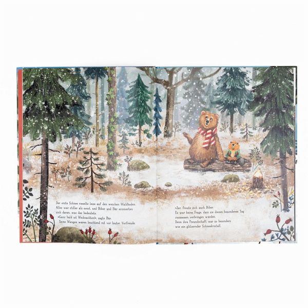 Der erste Schnee rieselt auf den Waldboden, und da wissen Biber und Bär: Ganz bald ist Weihnachten! Dieses Fest wollen die beiden natürlich gemeinsam feiern. Und so stapfen sie durch den zauberhaft verschneiten Wald, um all die Vorbereitungen zu treffen, die den Weihnachtsabend besonders machen: Sie sammeln Bucheckern und Tannenzapfen für den herrlichsten Baumschmuck, und der Biber fällt den größten Baum, den sie finden können. Doch der Baum ist so groß, dass Biber an den Bärenhöhlendecke klebt und Bär gar nicht mehr reinpasst.