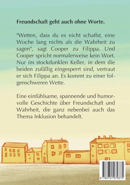 "Wetten, dass du es nicht schaffst, eine Woche lang nichts als die Wahrheit zu sagen?"Damit fordert Cooper Filippa heraus. Der Cooper mit den Hundebabys, der normalerweise kein Wort spricht. Und während alle in der Klasse den neuen "Schweiger" immer cooler finden, macht sich Filippa mit dem Nichts-als-die-Wahrheit-Sagen richtig unbeliebt. Eine Freundschaftsgeschichte voller Humor, Originalität und Herzenswärme. Großer Lesespaß, der "ganz nebenbei" das Thema Inklusion erzählt.